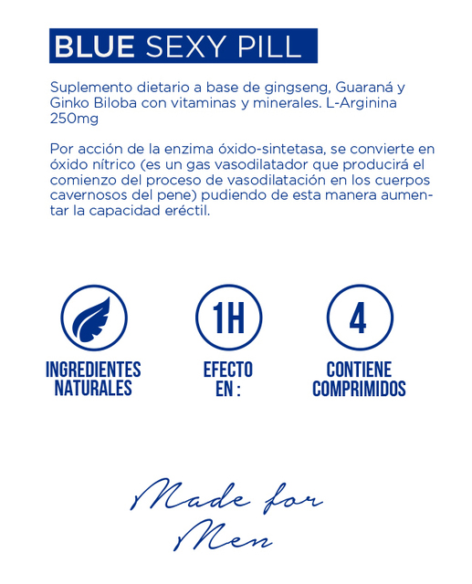 Suplemento dietario a base de gingseng, Guaraná y Ginko Biloba con vitaminas y minerales. L-Arginina 250mg Por acción de la enzima óxido-sintetasa, se convierte en óxido nítrico (es un gas vasodilatador que producirá el comienzo del proceso de vasodilatación en los cuerpos cavernosos del pene) pudiendo de esta manera aumentar la capacidad eréctil.