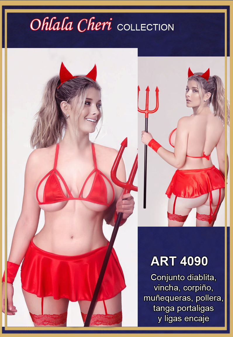 Conjunto diablita, corpiño, pollera, tanga portaligas, vincha, muñequeras y ligas encaje