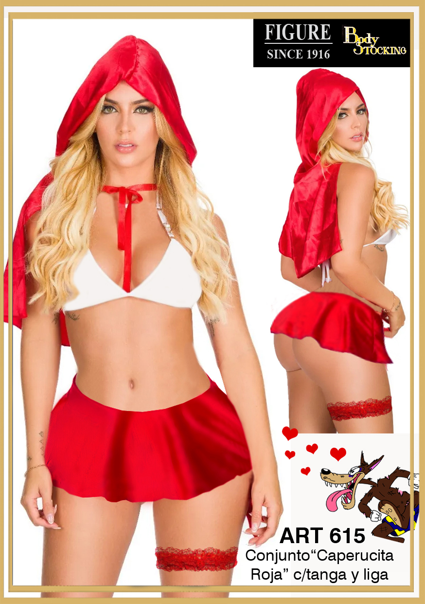 Conjunto diablita, corpiño, pollera, tanga portaligas, vincha, muñequeras y ligas encaje |