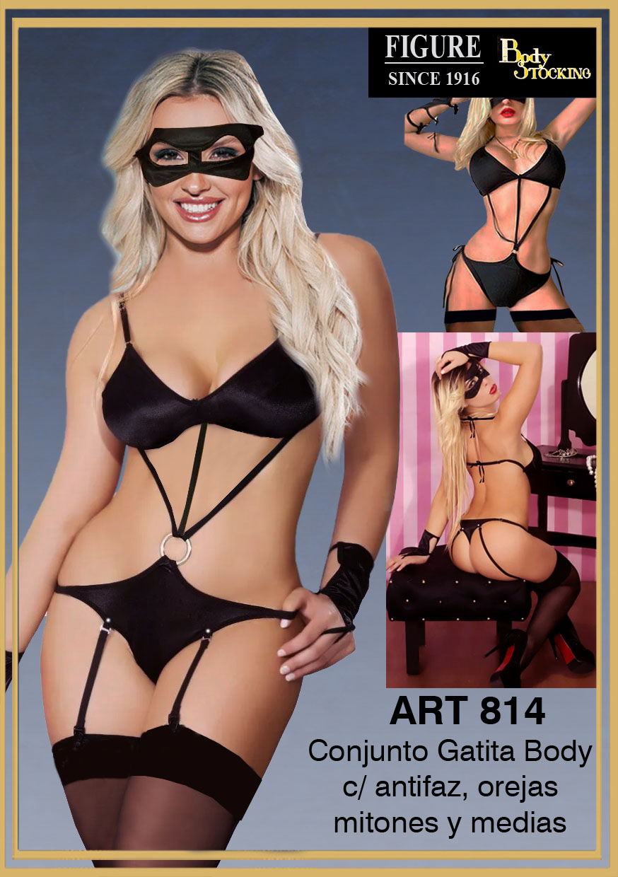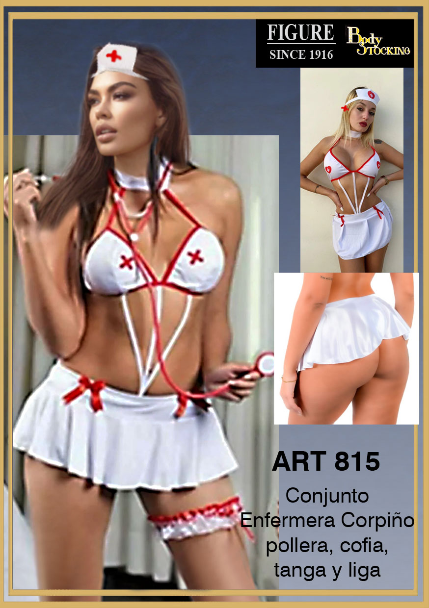 Conjunto enfermerita, top, tanga con portaligas, cofia, mitones y medias